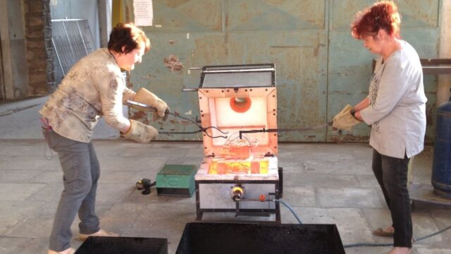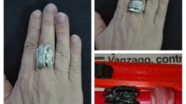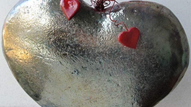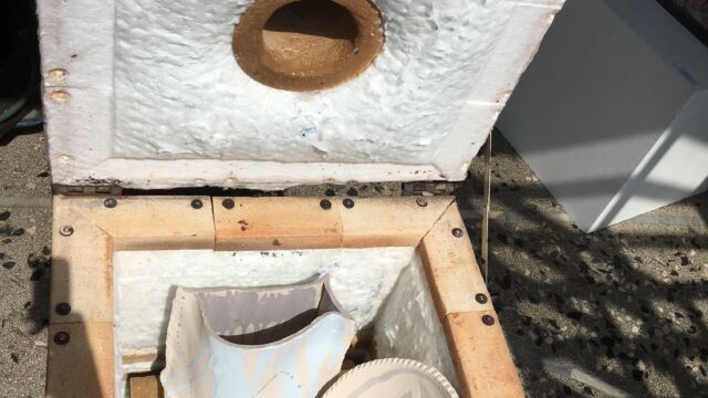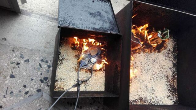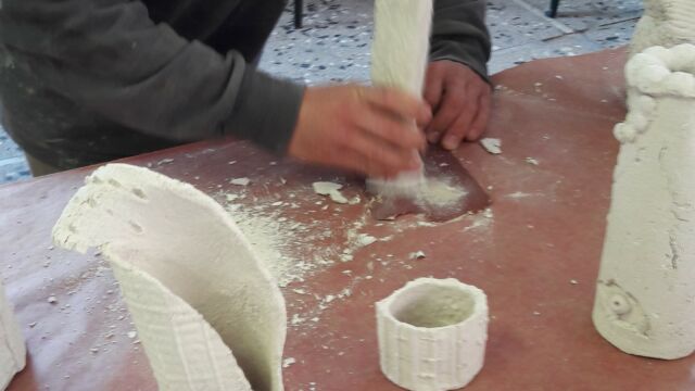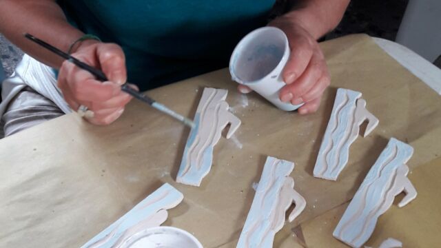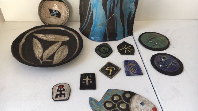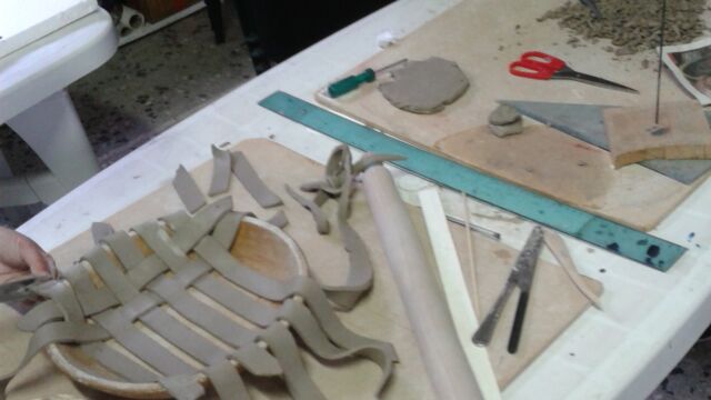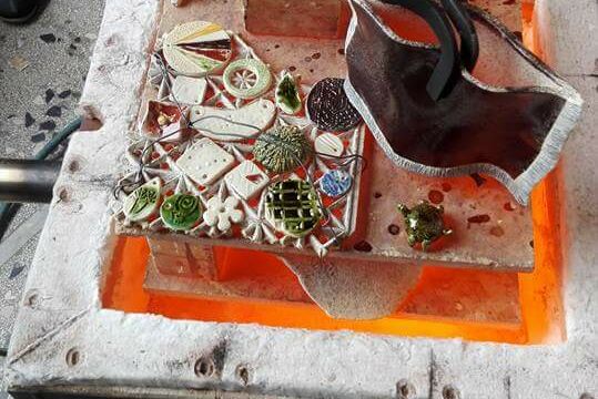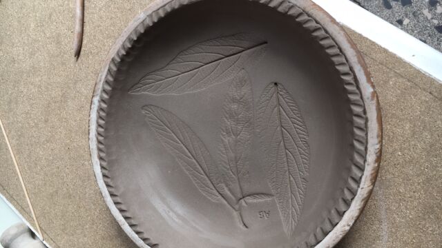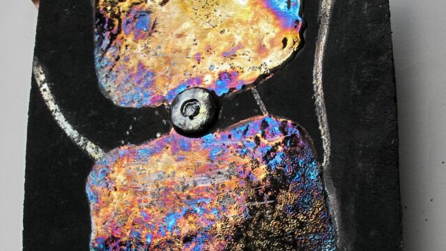 argilla nera colorata con ingobbi e incisa - sostegno in ferro